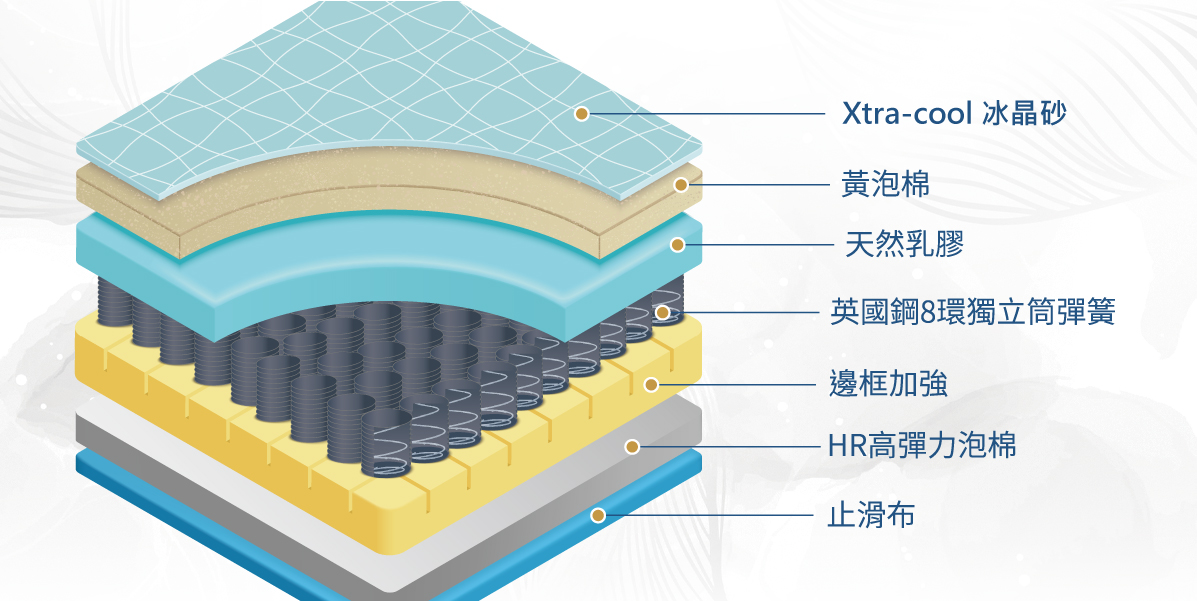Xtra-coo使用高分子導熱纖維,能快速的將熱量導到溫度較低的區域,保持長時間的睡眠不悶熱。