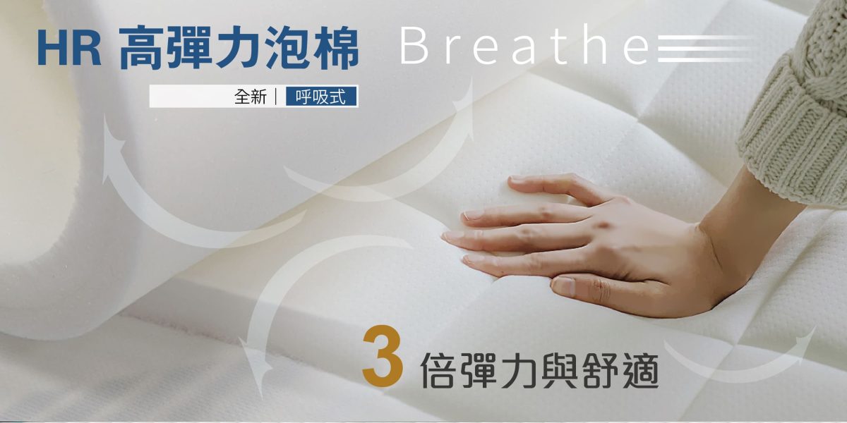 全新呼吸式HR氣墊棉,彈性和柔軟性高於一般泡棉3倍,不易變形,作為床墊內材可增加床墊的支撐性與穩定性,並發揮極佳的彈力,保持床墊的舒適性,讓身體得到最好的放鬆